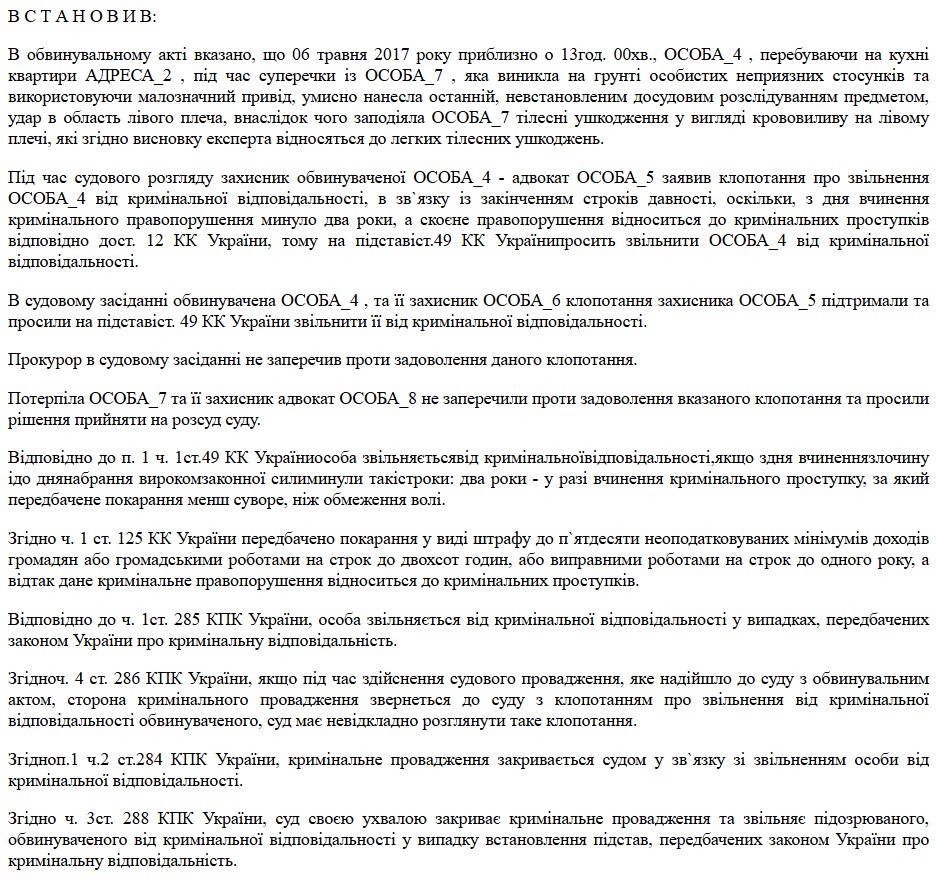 В обвинувальному акті вказано, що 06 травня 2017 року приблизно о 13год. 00хв., ОСОБА_4 , перебуваючи на кухні квартири АДРЕСА_2 , під час суперечки із ОСОБА_7 , яка виникла на грунті особистих неприязних стосунків та використовуючи малозначний привід, умисно нанесла останній, невстановленим досудовим розслідуванням предметом, удар в область лівого плеча, внаслідок чого заподіяла ОСОБА_7 тілесні ушкодження у вигляді крововиливу на лівому плечі, які згідно висновку експерта відносяться до легких тілесних ушкоджень.