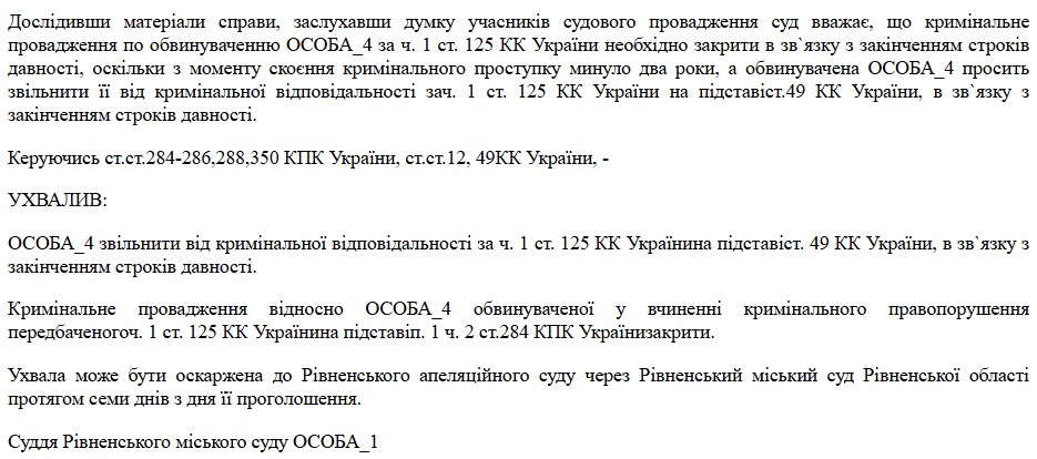 ОСОБА_4 звільнити від кримінальної відповідальності за ч. 1 ст. 125 КК Українина підставіст. 49 КК України, в зв`язку з закінченням строків давності.